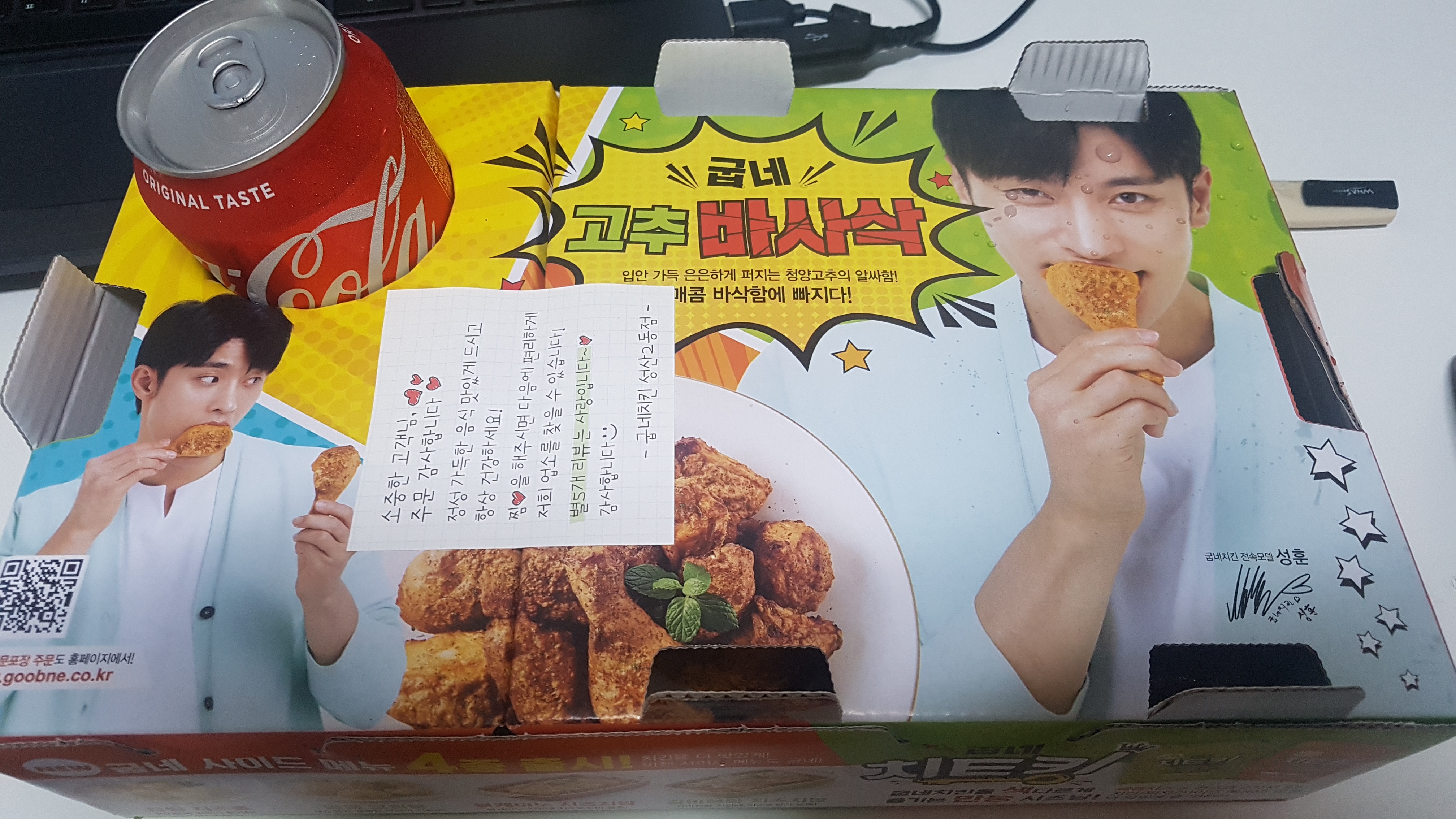 굽네 고추 바바삭입니다. 지역에 따라 음료의 크기는 차이가 있습니다. 치킨 박스가 굉장히 큽니다.