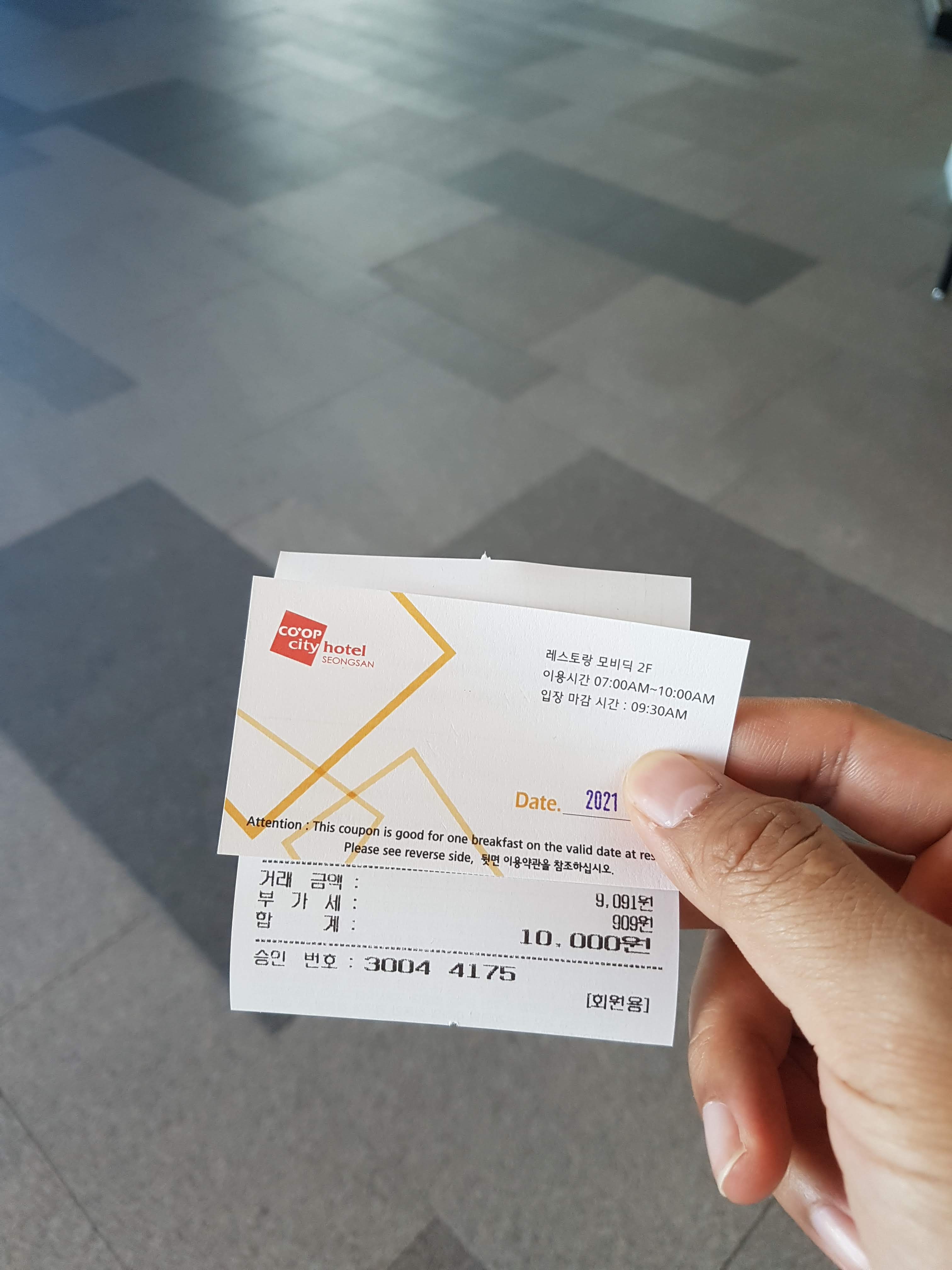 코업 시티 성산의 조식을 이용해보았습니다. 밀쿠폰은 1층 로비에서 구매 가능했습니다. 1인당 10000원입니다. 조식 레스토랑은 2층에 바로 있습니다.