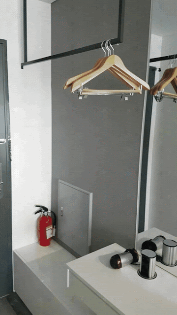 세면대가 객실에 노출되어 있는 타입이에요. 세면대에는 헤어드라이기와 비누가 준비되어 있고, 그 옆에 티 세트와 냉장고가 있습니다. 냉장고 안에는 무료 생수가 2병이 준비되어 있어요.
