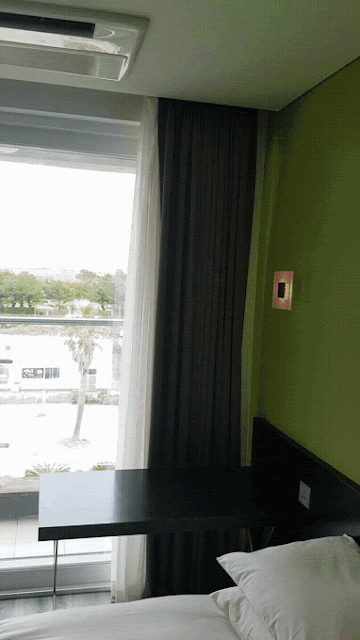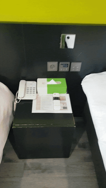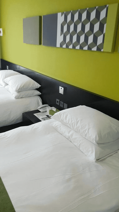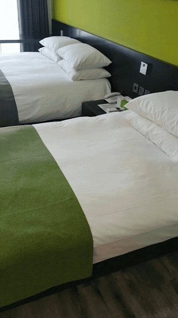 로비에서 체크인을 하고 514호를 배정받았습니다. 예약한 룸타입은 디럭스 트윈 베드룸이에요. 더블 베드와 싱글베드로 구성되어 있어서 3인까지 투숙이 가능한 룸입니다. 연두색이 인상 깊은 인테리어에요.