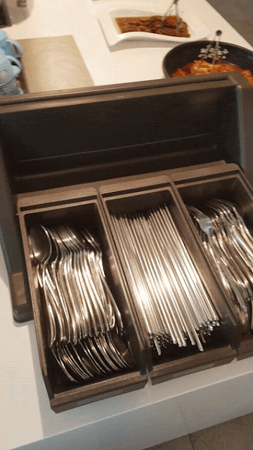 어린이 수저와 포크, 식판도 있어서 가족과 함께 식사하기 편리했습니다. 핫푸드가 준비되어 있었는데요. 스크램블 에그, 스파게티 면 & 토마토소스와 크림소스, 크림수프, "김치 콩나물국"이 준비되어 있었어요. 저 "김치 콩나물 국"이 진짜 예술적인 맛이었어요. 최고!