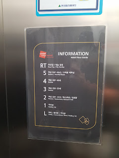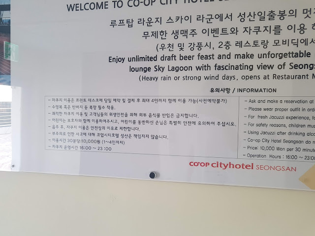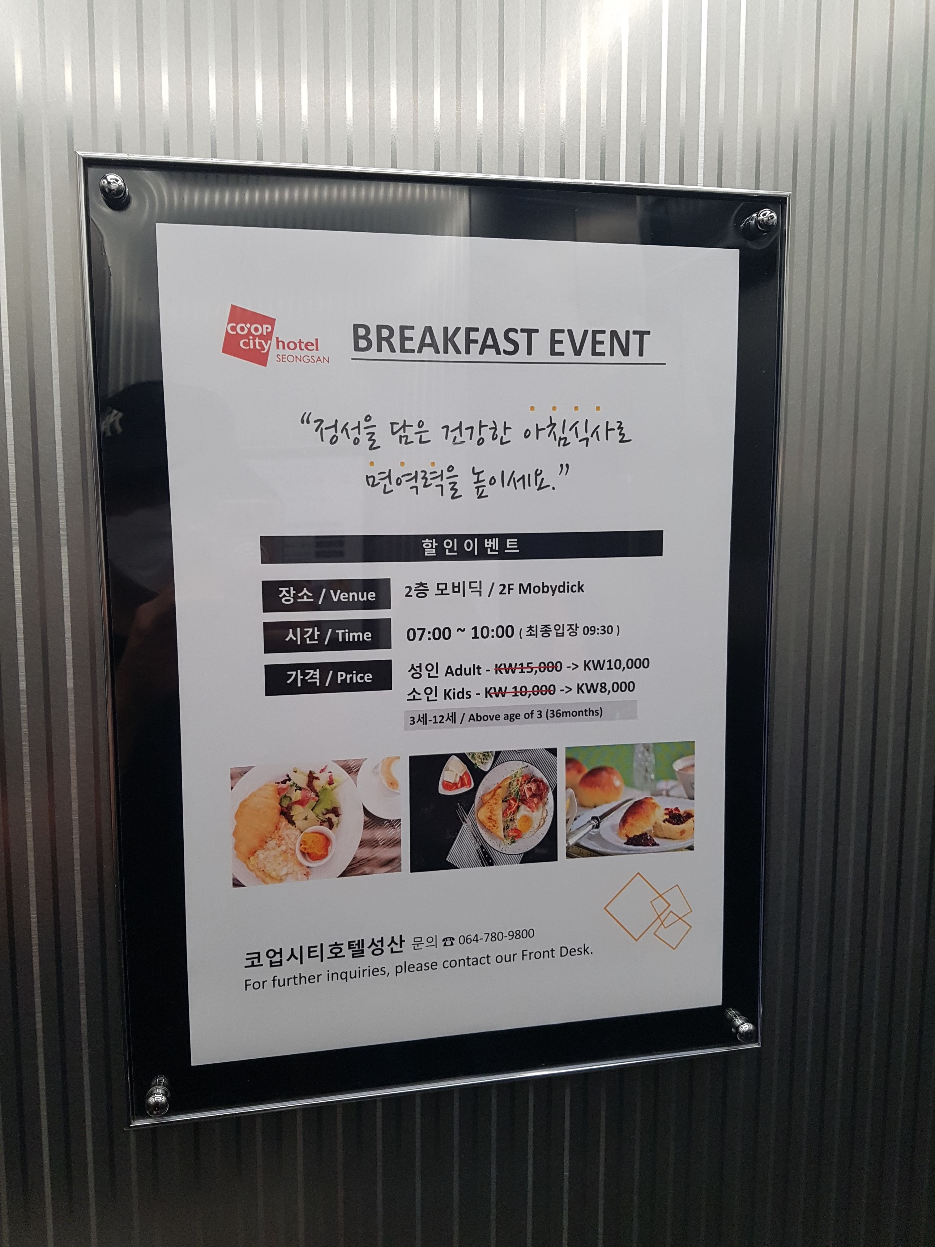 5층인 낮은 건물이에요. 3,4,5 층이 객실입니다. 그리고 조식 안내문입니다. 조식이 제주도 여행에서 제일 괜찮았어요.
