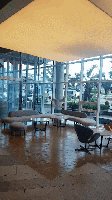 3시에 체크인했습니다. 로비가 호텔 밖의 배경 덕분에 멋집니다.