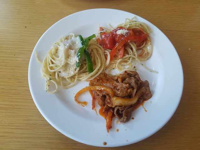 마지막으로 잊어버린 메뉴를 담아왔어요. 스파게티와 돼지 불고기입니다! 스파게티는 토마토 소스 스파게티, 크림 소스 스파게티를 만들어 먹을 수 있어요. 깔끔한 맛이에요. 돼지 불고기는 정말 맛있게 먹었어요.