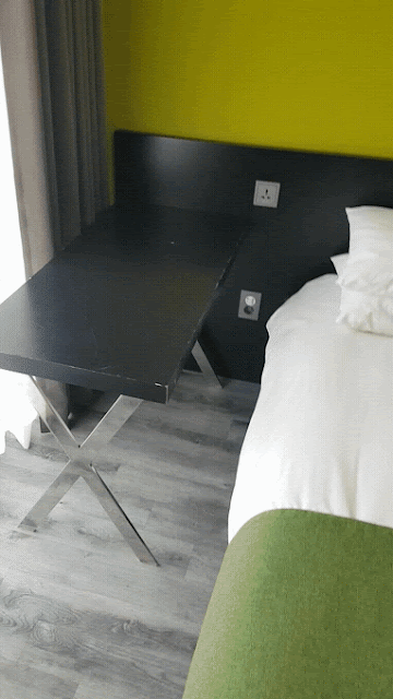 두 베드 옆에는 큰 검은색 테이블이 있습니다. 같이 쓸 의자는 없어요. ㅋㅋ. 베드 옆에는 폰을 충전할 수 있는 소켓이 달려있어요.