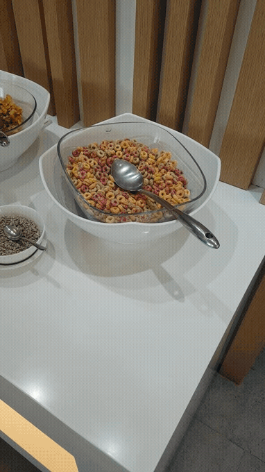 씨리얼과 우유가 있고, 음료 바에서는 과일 주스, 커피 그리고 티를 즐길 수 있었어요.