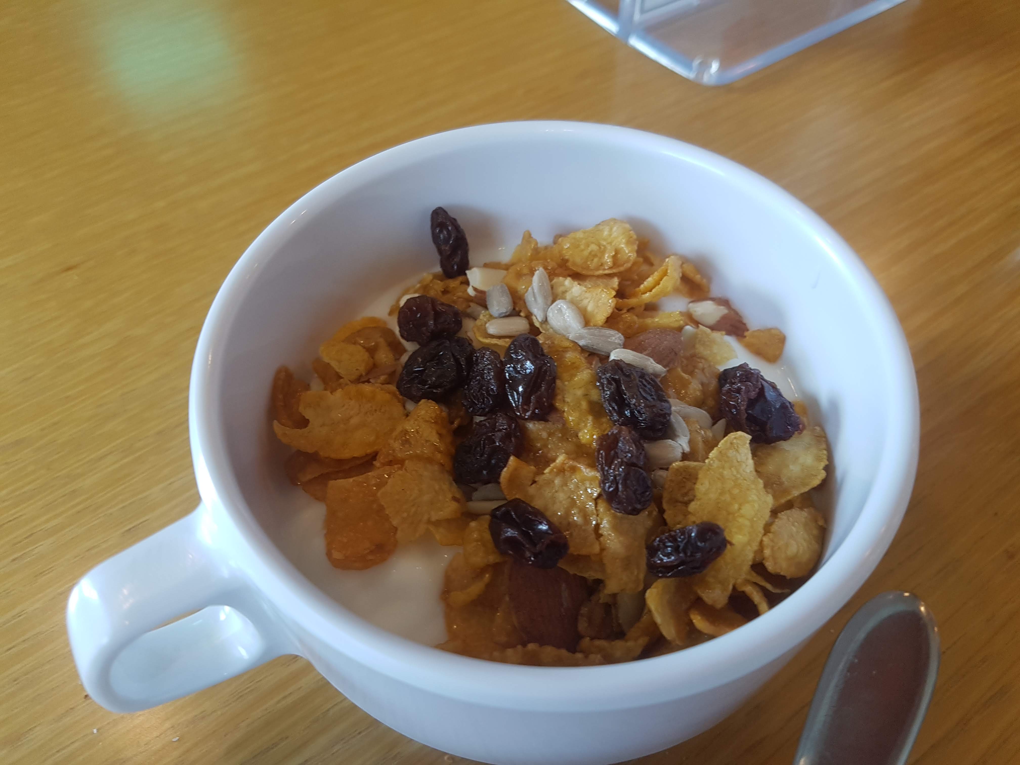 씨리얼도 먹어보았습니다. 건포도와 해바라기씨와 같은 토핑이 다양하게 준비되어 있었어요.
