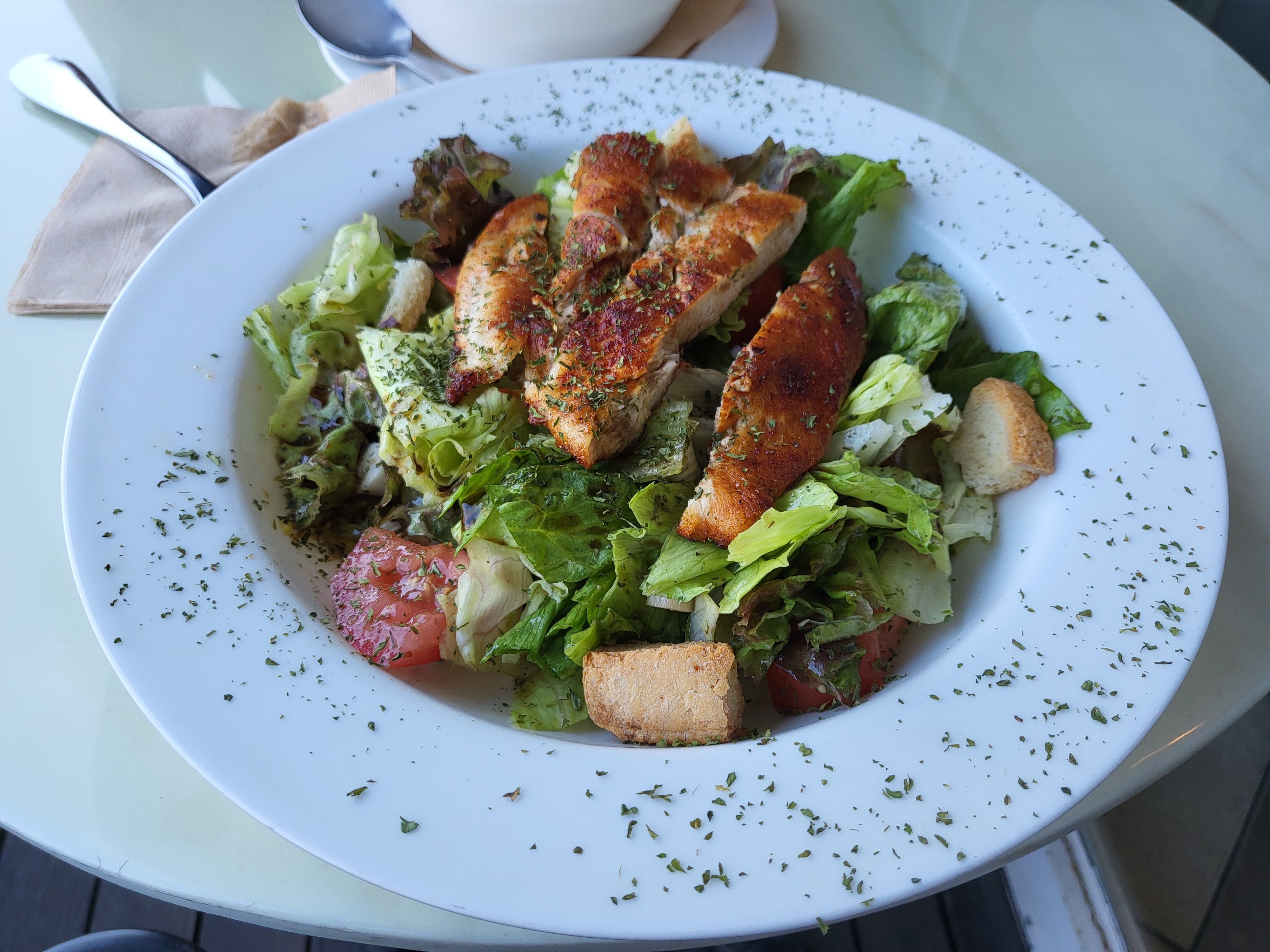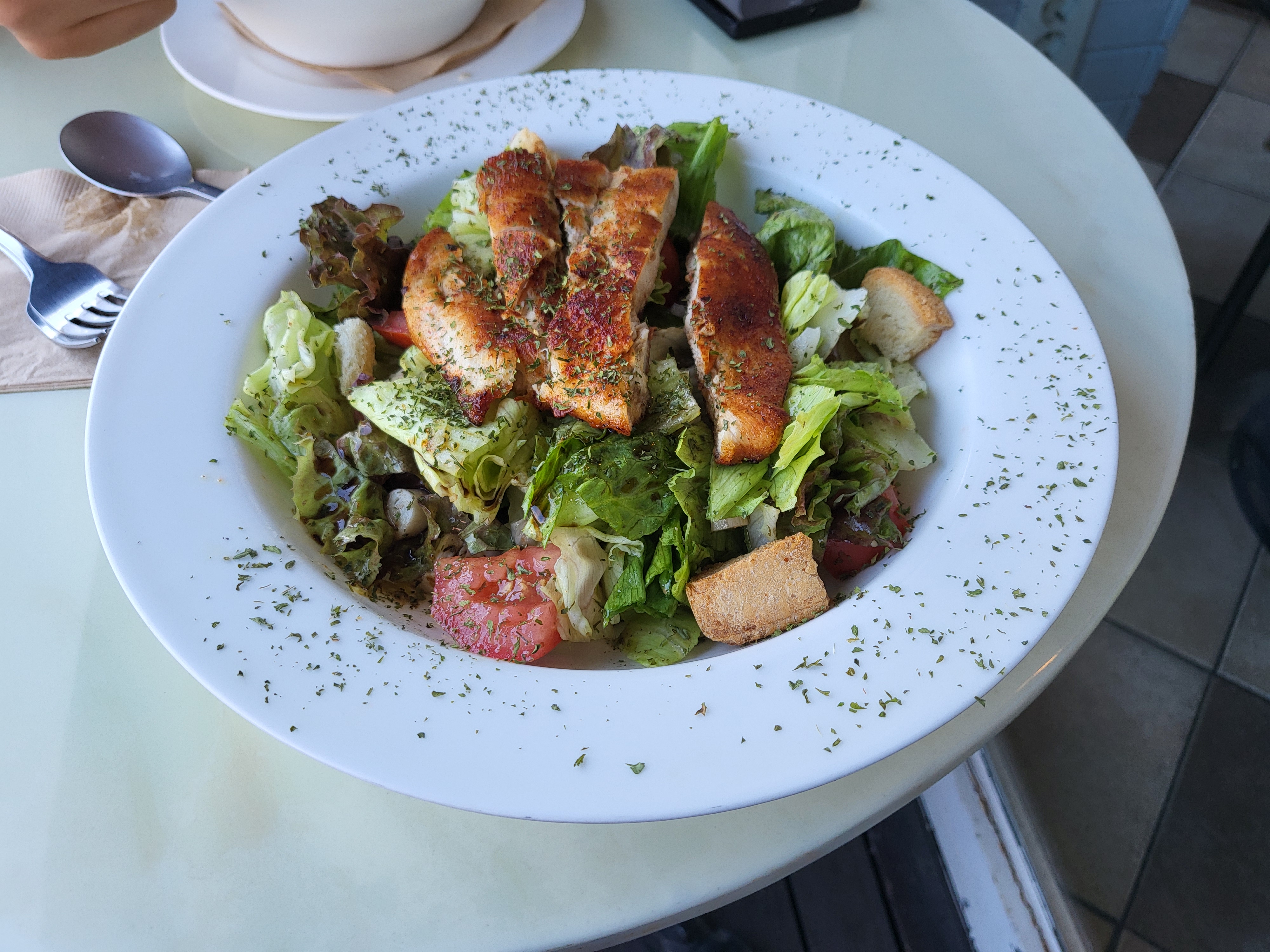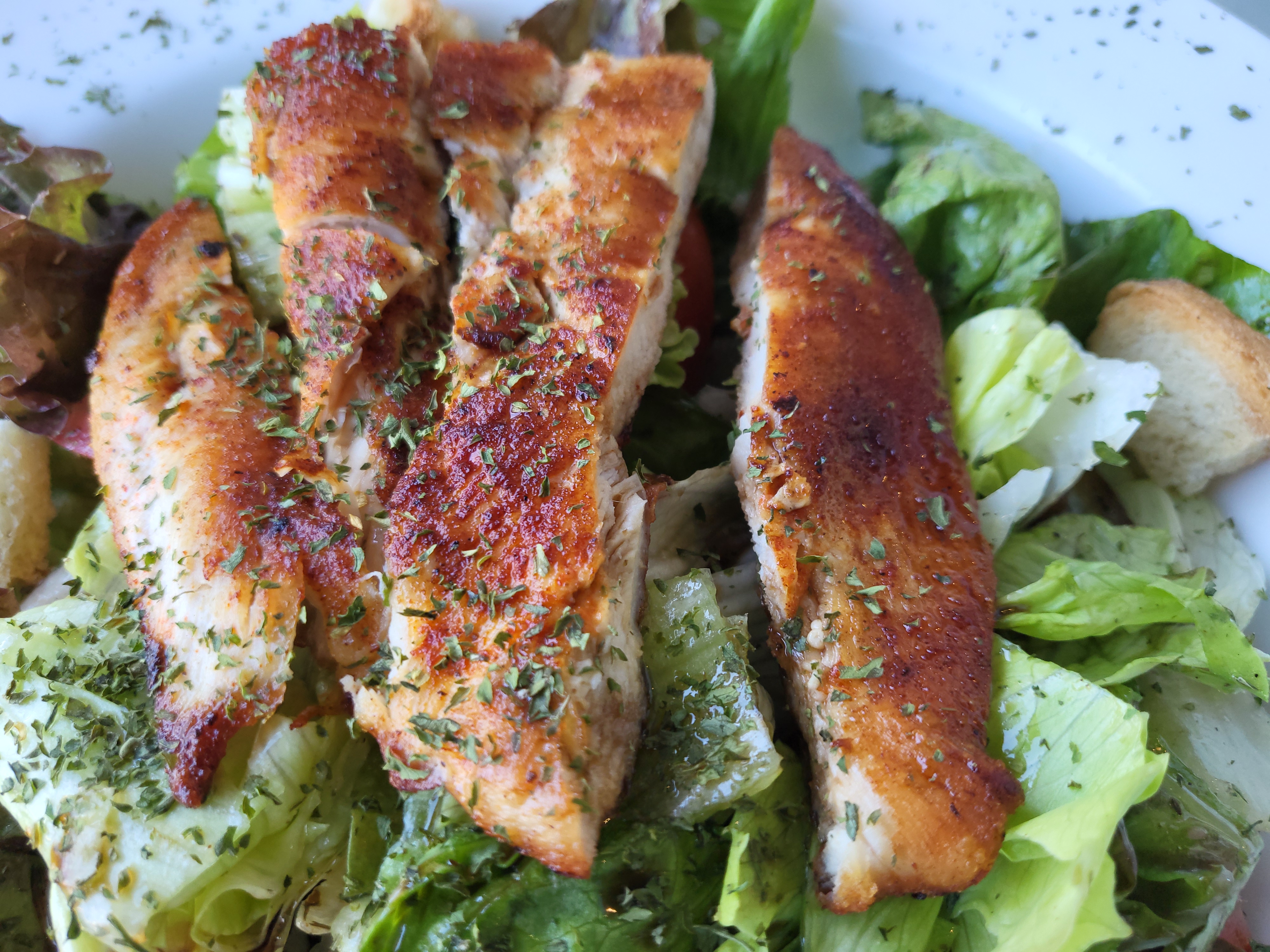 맛는 발사믹 베이스 드레싱에 시어링한 치킨, 숨죽운 상추 더미. 이와중에 크루통은 겉돌아요.