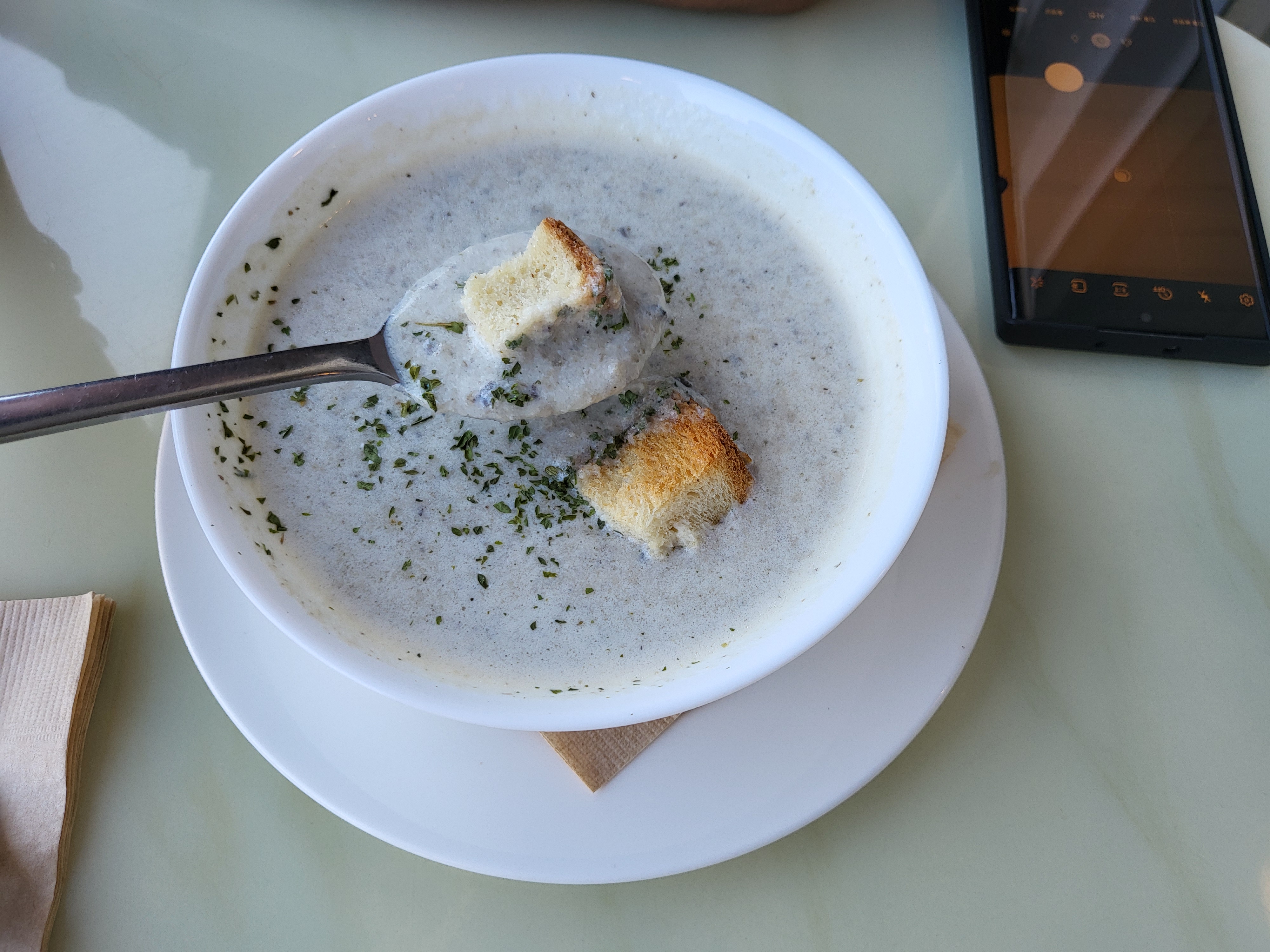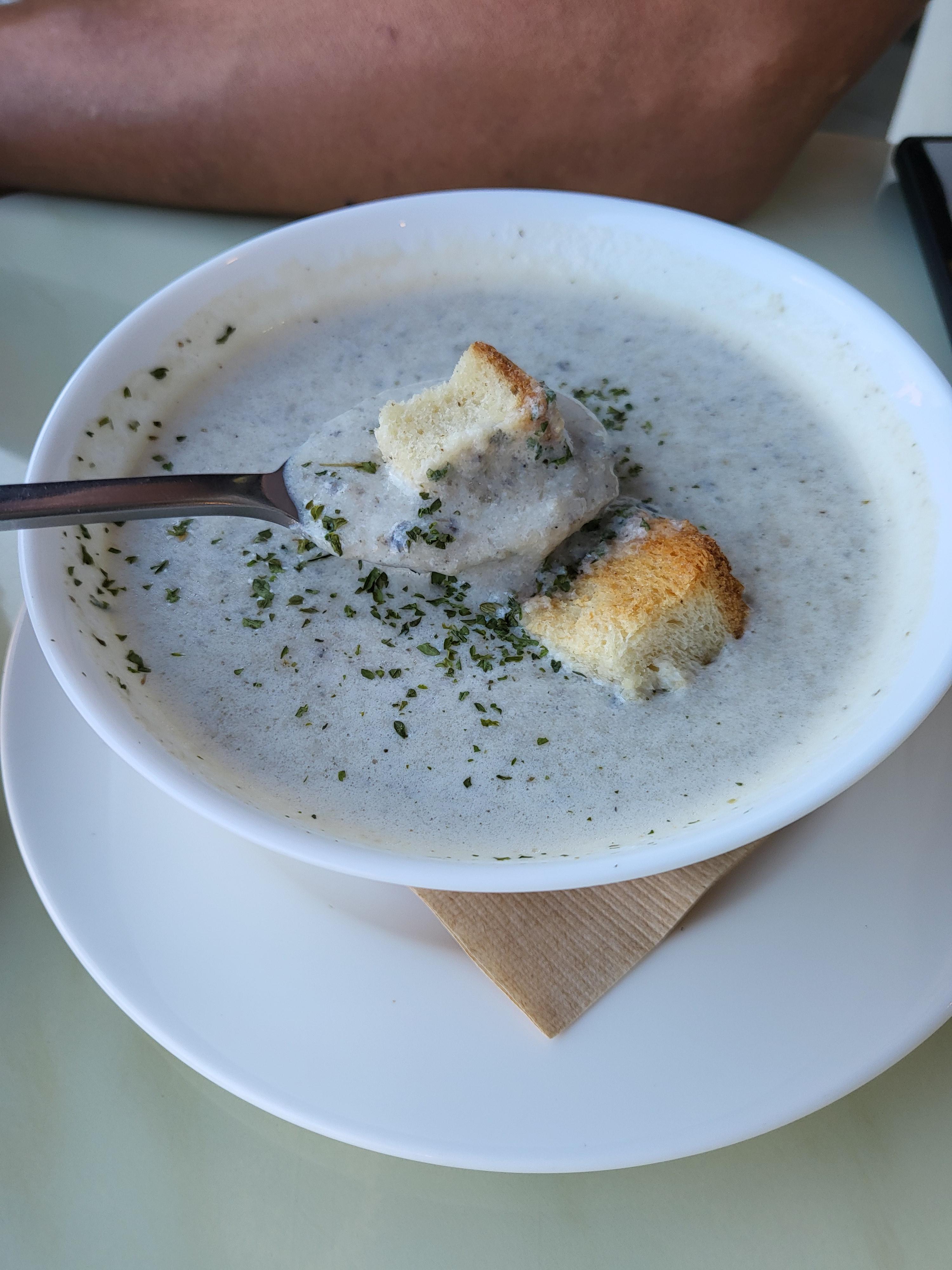 지난번엔 토마토수프 먹었거든요. 저는 버섯이 더 맛있네요.