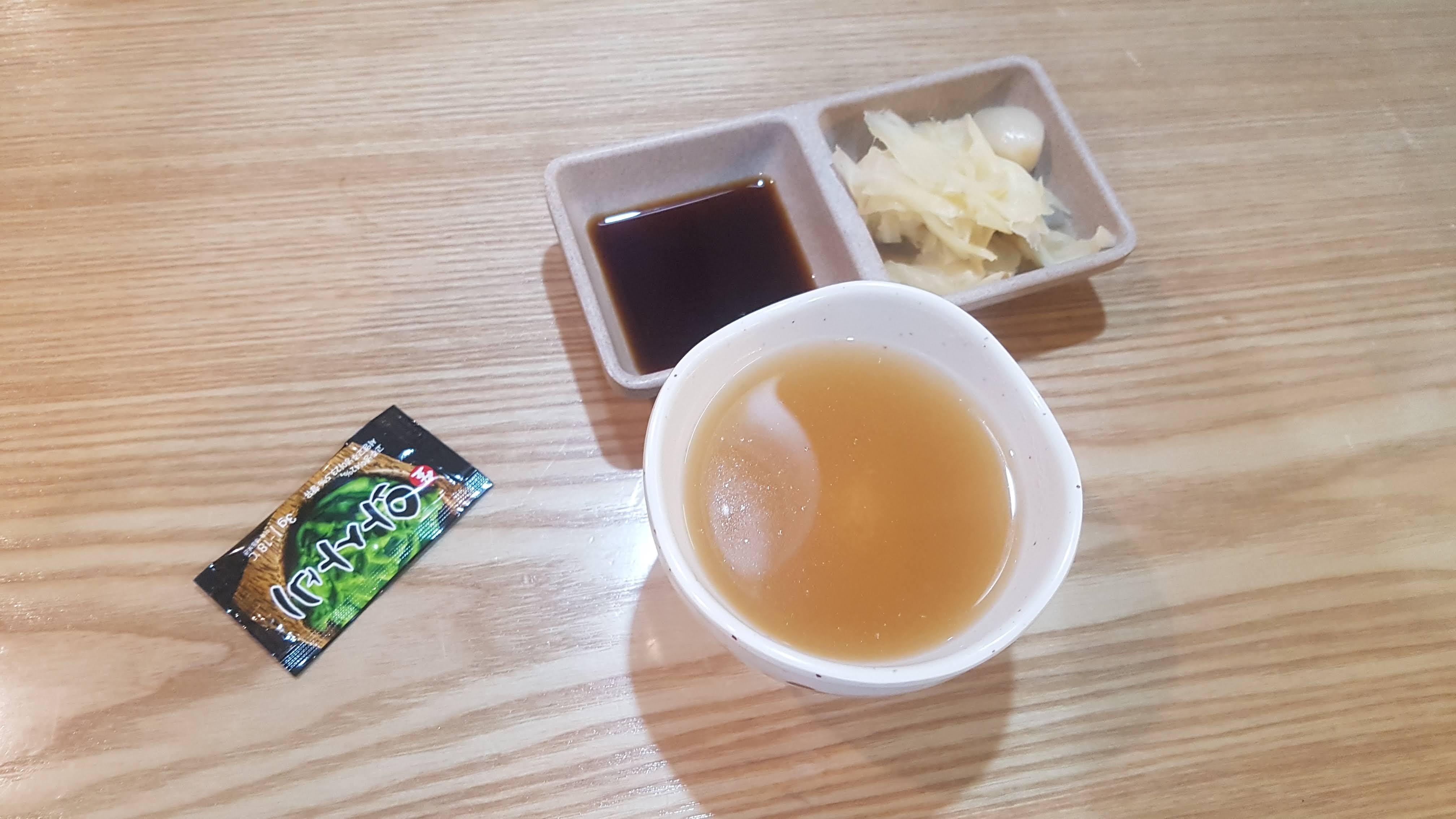 락교와 생각절임, 장국, 와사비. 와사비가 일회용이라 좋았어요. 훨씬 위생적.