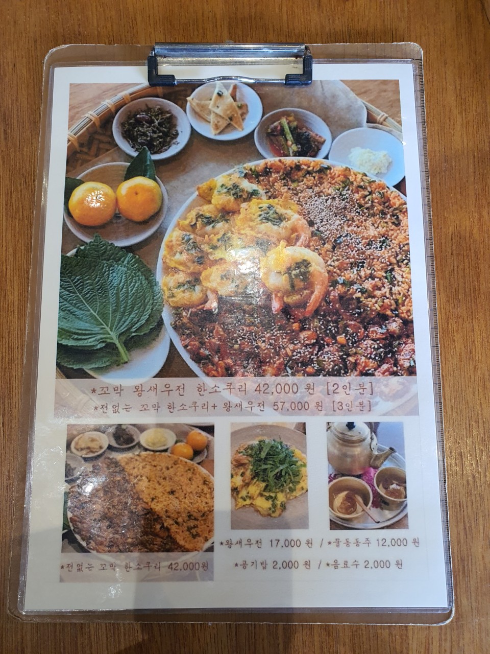 메뉴는 단일 메뉴! 꼬막 왕새우전 한 소쿠리입니다. 42000원. 2인분 기준이에요. 새우전을 안하고, 꼬막무침과 비빔밥으로 구성할 수도 있습니다.
