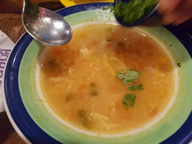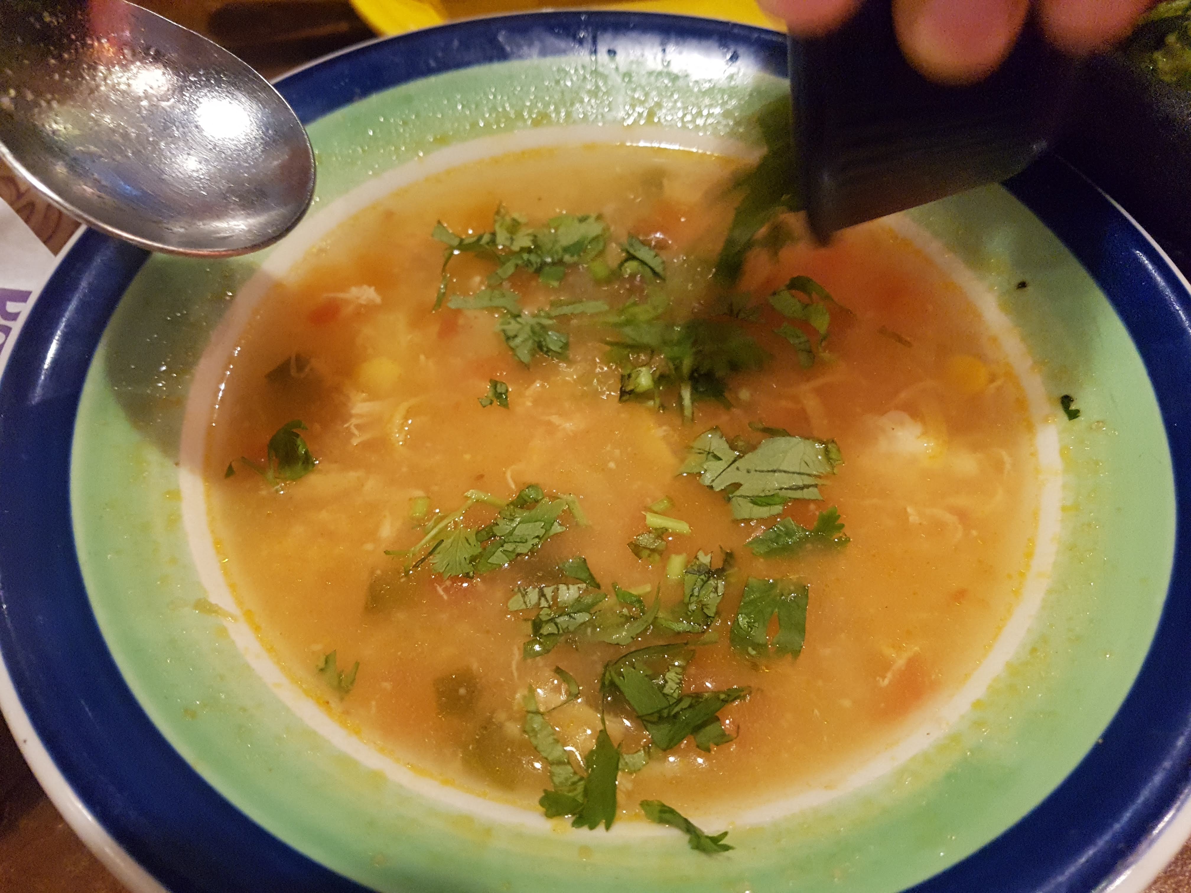 그리고 치킨 토마토 온더보더 수프입니다. 5만원 가격 맞출라고 시켰는데, 고수 넣어서 먹으면 여기가 메히꼬.