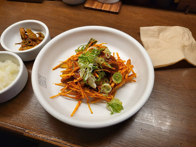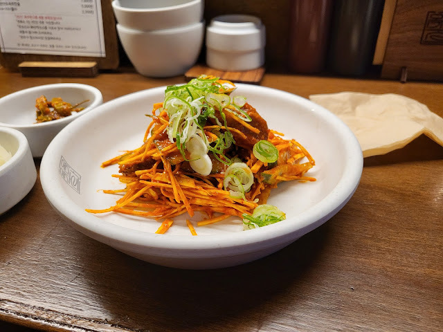 에피타이저로 나온 쇠고기초무침입니다. 이것을 먼저 내주신다고 죄송해 하시더라구요. 먼저 먹으면 에피타이저 아닌가요? ㅎㅎㅎ 맛있는 맛이었어요. 맵기가 어느 정도 있구요. 정말 골뱅이가 땡기던 그맛이에요. 저 채가 고구마래요. 그래서 또 색달랐어요.