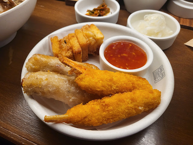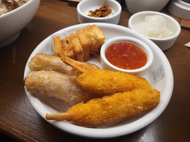 모둠 튀김입니다. 멘보샤 2 점을 8천원이라는 가격 안에서 즐길 수 있는 가성비가 있을까요. 저 게살 튀김 기성품인데, 정말 고급스럽게 잘 튀기셨어요. 기름이 깨끗하다는 증거겠죠.