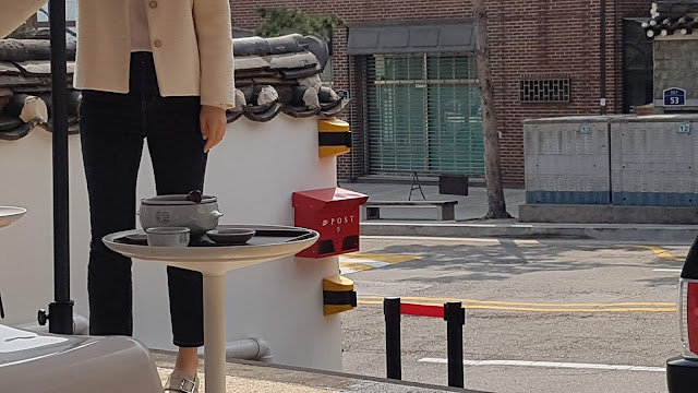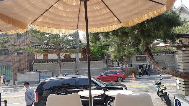 그렇지만 저는 이 파라솔 야외석을 앉았습니다. 의자는 이케아 플라스틱 3만원짜리 아시지요? 안락하긴 합니다. 그리고 이 도로 변을 보면서 음료를 마실 수 있어요. 사람 구경하기 좋습니다. 삼청동에 놀러온 커플과 가족들 그리고 시니어분들 동시대를 살아가고 있는 우리.