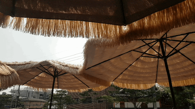 가장 먼저, 안국 쪽에서 헌법 재판소 쪽으로 올라오시면 많은 카페를 볼 수 있는데, 그 중의 아사구아 카페입니다. 대로 변에 눈길을 사로 잡는 트로피컬 파라솔이 있는 카페입니다.