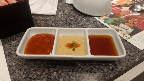 3색 소스에 찍어 먹습니다. 스위트 칠리, 땅콩 소스, 간장 소스에요.