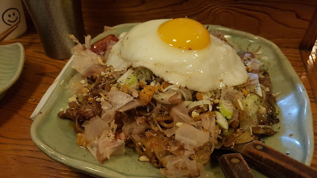 야키소바입니다. 토핑이 화려하지요. 야키소바는 이번에 처음 먹어봤는데요. 야키소바도 맛있어요. 고기가 듬뿍 들어있어서 식감이 최고에요. 가다랑이포가 움직이는 모습을 포착해봤어요. 굉장히 먹음직스럽지요? 계란도 반숙 완숙을 선택할 수 있게 해놓았어요. 맛있는 야키소바였어요.