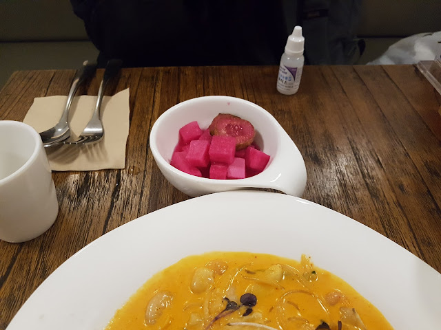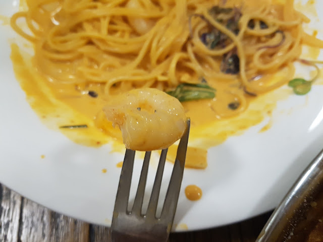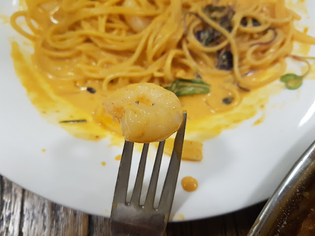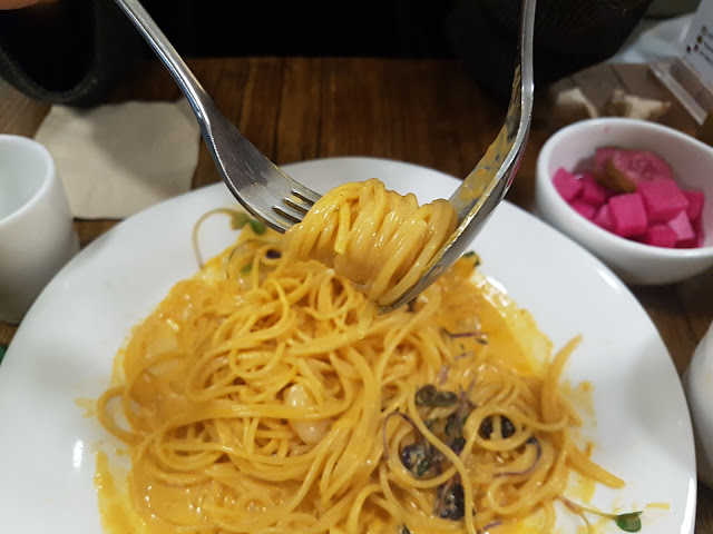 엔쵸비 오일 파스타입니다. 엔쵸비는 보이질 않고, 비린 맛도 없습니다. 로제 느낌이 나면서 어떻게 이런 색이 나는 엔쵸비 파스타지? 했는데, 고추장이랑 크림 조합인 것 같아요. 마늘기름 향도 나면서, 새우 알 큰 게 많이 들어 있답니다.