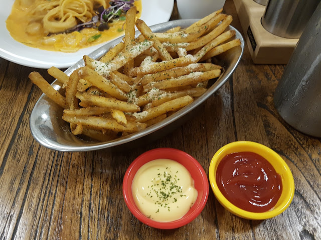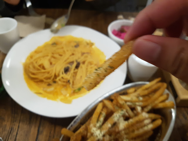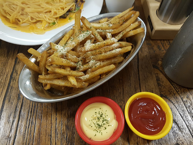 프렌치 프라이는 핸즈 스테이크에 들어가는 것과 같은 제품이었어요. 파스타랑 피자 먹기도 배불러서 남겼네요. 위대하지지 않다면 비추합니다.