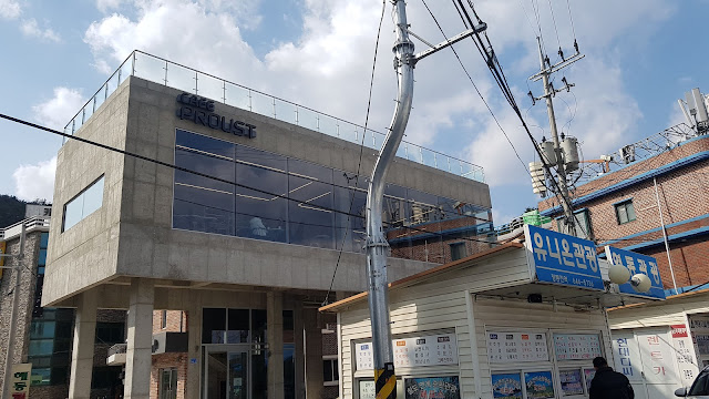 Ini adalah kafe "Proust" di depan stasiun "Jeongdongjin". Beton ekspos menunjukkan tampilan yang mengesankan. Ini memiliki pemandangan stasiun "Jeongdongjin" dan pantai Laut Timur.
