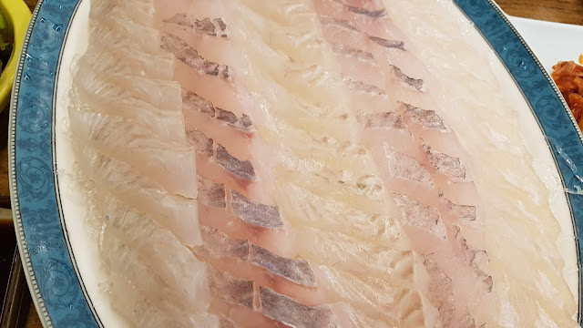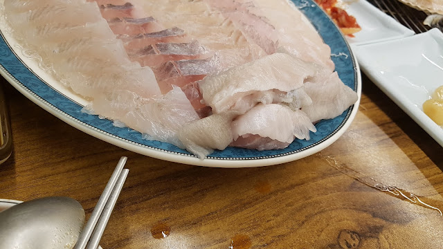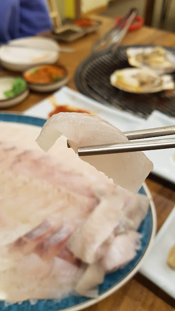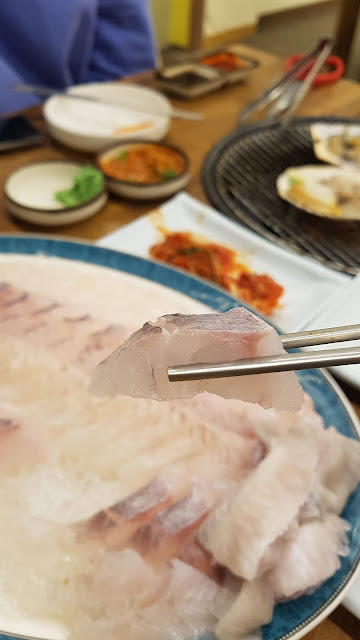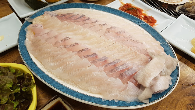 메인 디쉬인 "광어와 우럭 회"가 나왔습니다. 개인적으로 광어 회를 좋아해요. 향이 좋습니다. 확실히 서울에서 먹는 것보다 싱싱하고, 맛이 좋아요!