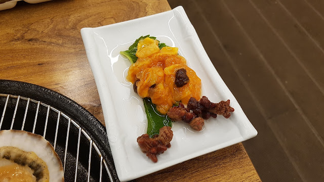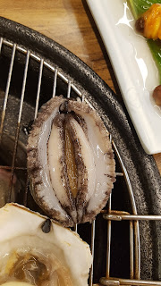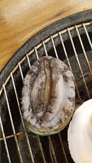 Bào ngư còn tươi sống. Sò điệp có vị bùi ở thái dương nên rất dai. Nó có hương vị tuyệt vời bởi vì nó được ăn với tỏi cắt lát, ớt đỏ và tương ớt đỏ! Tôi cảm thấy như đang ở bãi biển.