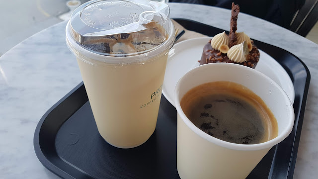 Đây là Americano (5000 won) và bánh tôi đã đặt. Bánh là một loại bánh sô cô la có tên là "Roche" (7500 won).