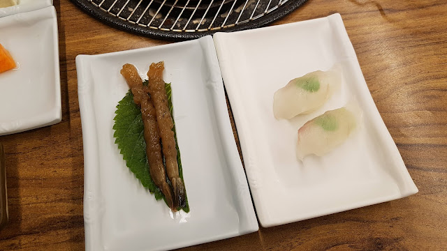 และ "กุ้งแช่น้ำปลา" ซูชิ. มันคือ "Mulhoe" เครื่องเคียงโดยทั่วไปก็อร่อย มันเยอะมากดังนั้นถ้าคุณกินอิ่มคุณจะไม่สามารถเพลิดเพลินกับอาหารจานหลักได้! นิดหน่อย!
