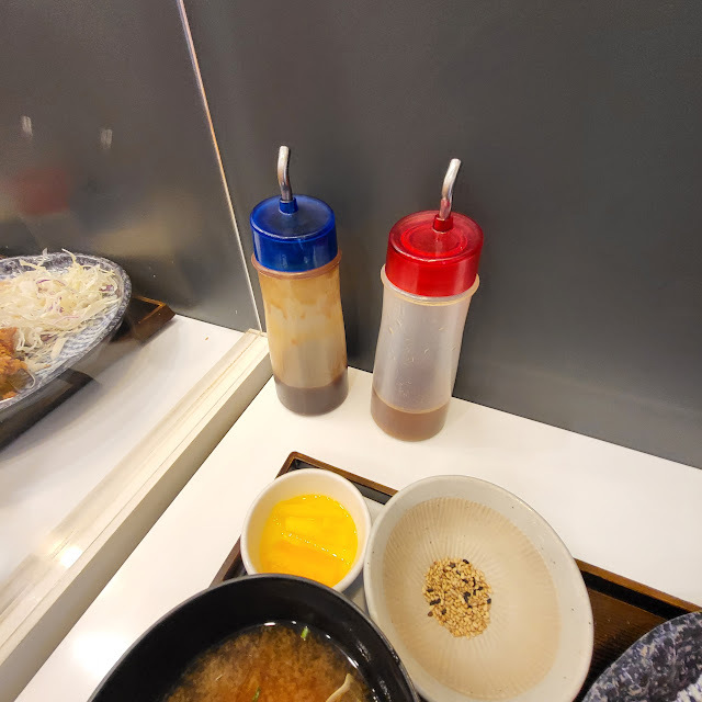 기본 돈까스 소스와 양배추 샐러드 소스입니다. 양배추 샐러드 소스는 참깨 소스는 아니에요. 폰즈 소스 같아요.