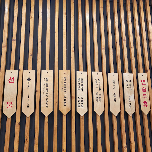 메뉴에요. 돈가스(돈가스 1장)은 3천원입니다. 트루꼬숑돈가스(돈가스 2장)은 5천원이고, 레알꼬숑돈가스(돈가스 3장)은 7천원이에요. 여성분의 경우에는 그냥 돈가스면 충분할 거 같에요. 남자분들은 트루돈가스 먹으면 조금 배부른 정도로 양이 꽤 됩니다. 레알꼬숑돈까스는 웬만한 대식가는 되야지 다 먹을 수 있을 거 같더라구요. 그 이유는 돈가스의 고기가 상당히 두꺼워요. 그리고 느끼한 돈까스를 상큼하게 해줄 겨자나, 김치, 청량 고추가 없어서 쉽게 물리는 점이 있습니다. 저는 트루돈가스도 많더라구요. 다 먹긴 했어요.