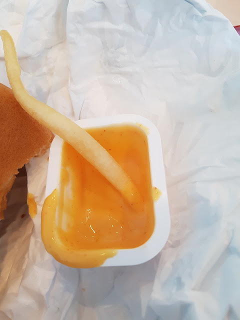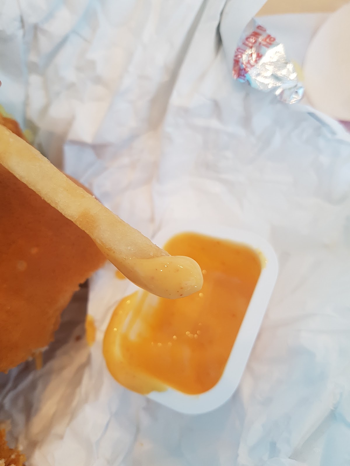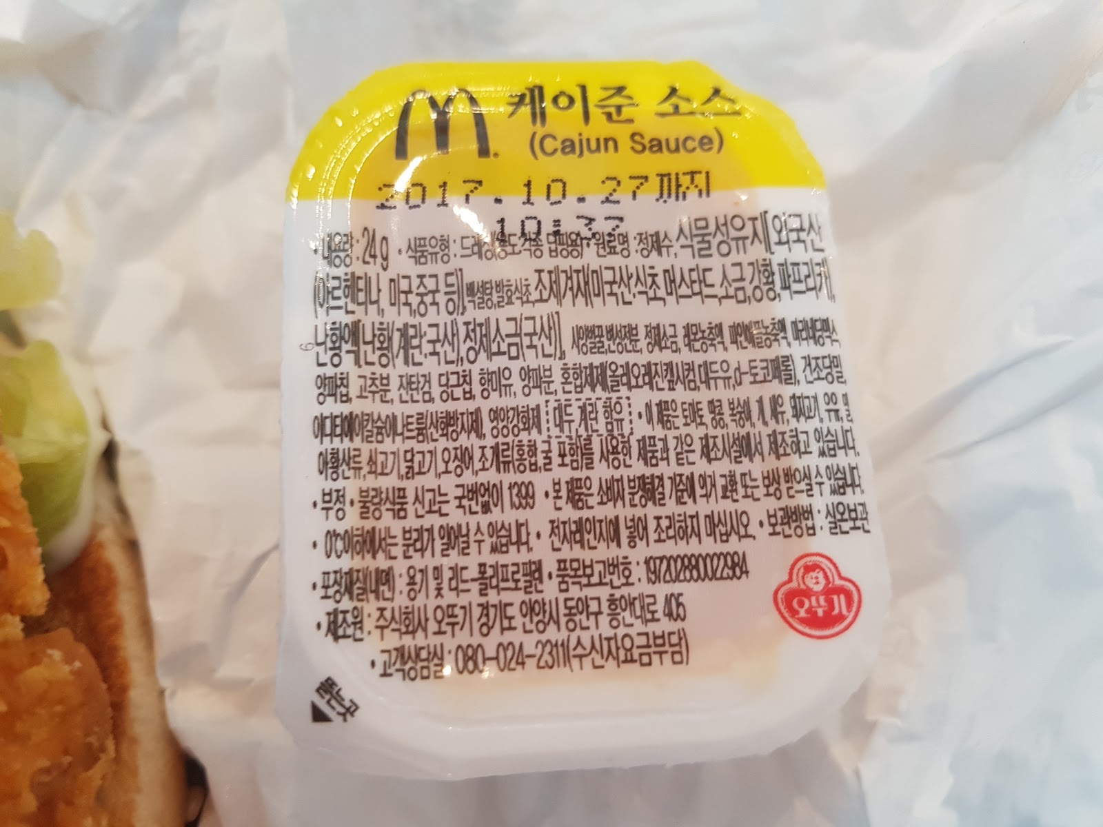 케이준 소스는 어디에? 보이질 않네요. 사실 케이준 소스 맛이 잘 안났어요. 워낙 상하이 스파이스 치킨 버거 향이 강해서 인지, 케이준 소스를 2개 이상 뿌려먹어야 하는 건지 생각이 들더라구요.