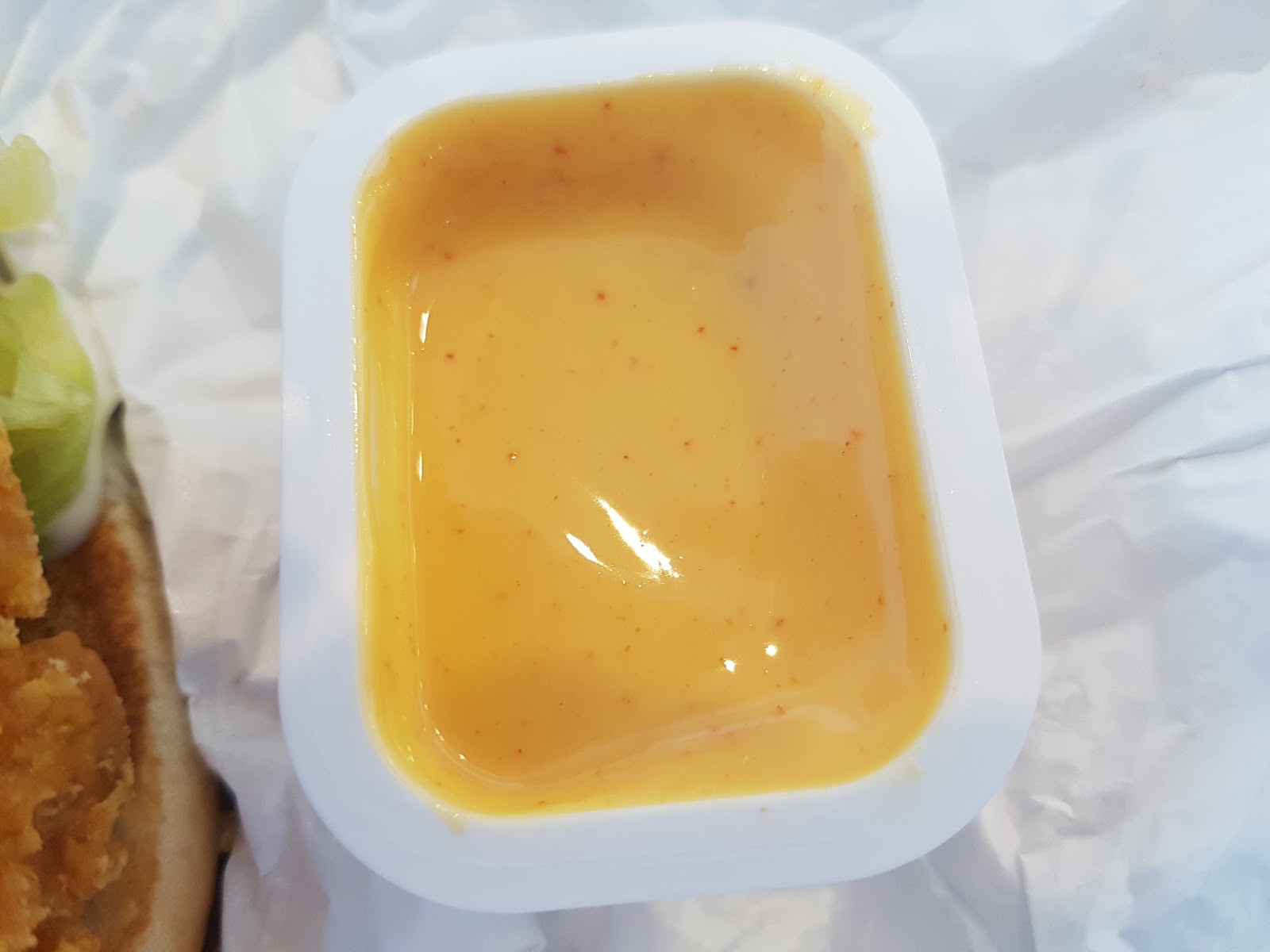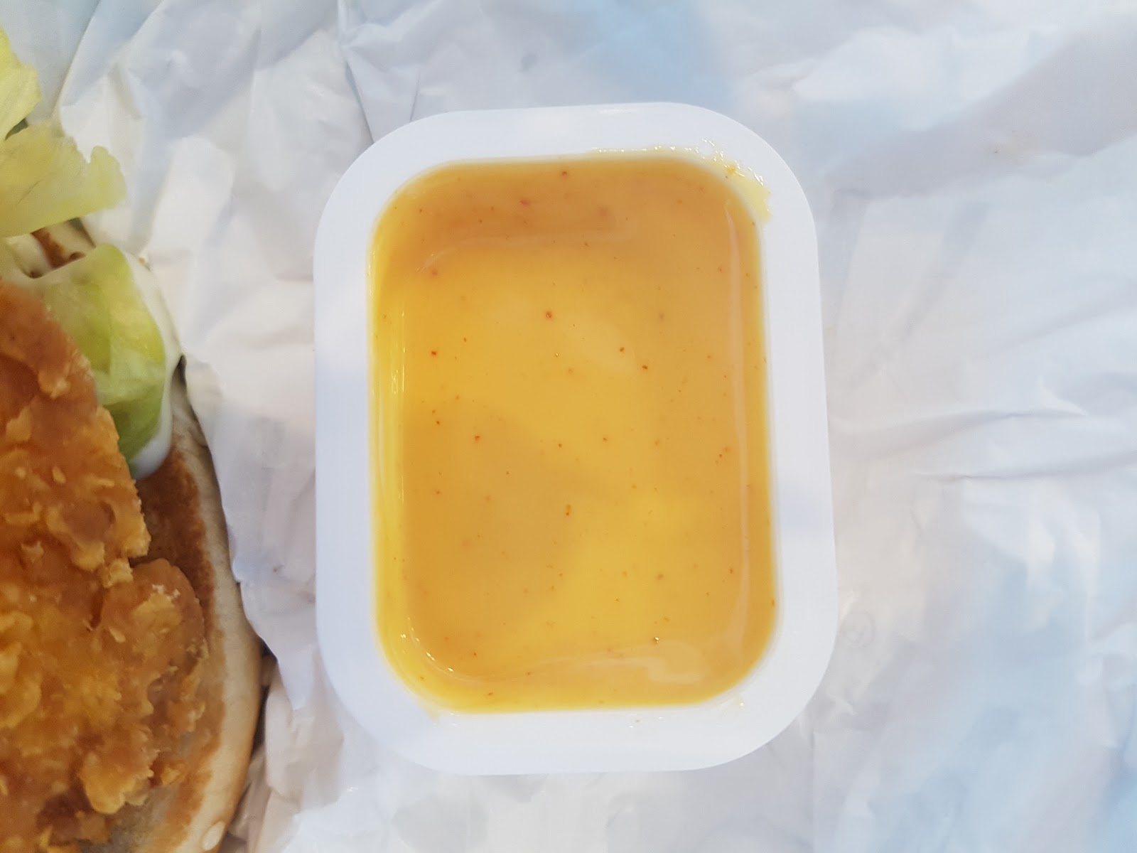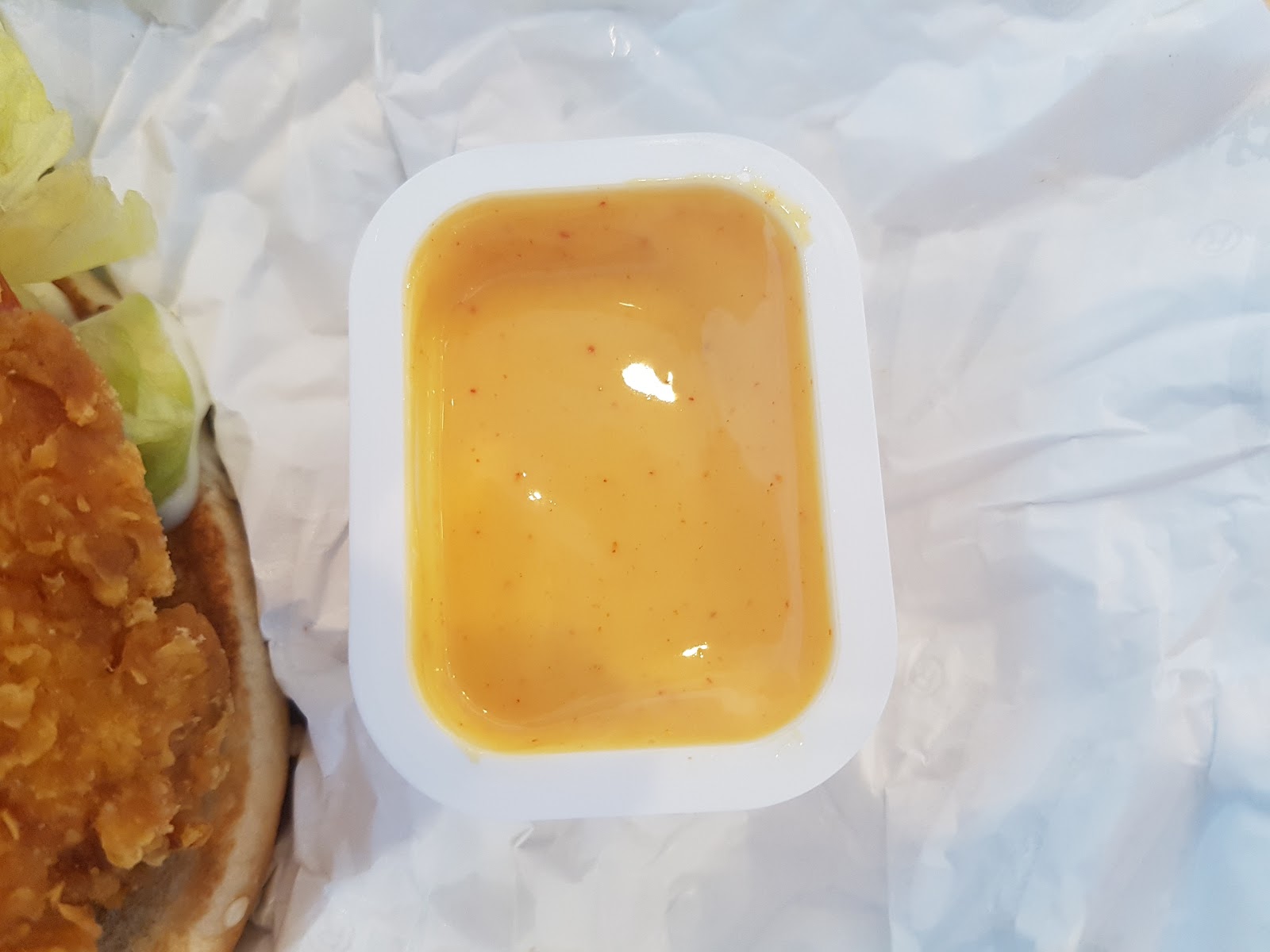 케이준 소스의 뚜껑을 따줍니다. 그러면 이렇게 이쁜 색의 소스가 나오는데요. 상하이 스파이스 치킨 버거가 다소 퍽퍽한 감이 있는데, 입에서 매끄럽게 씹히는 맛을 이 케이준 소스가 준다고 할 수 있어요.