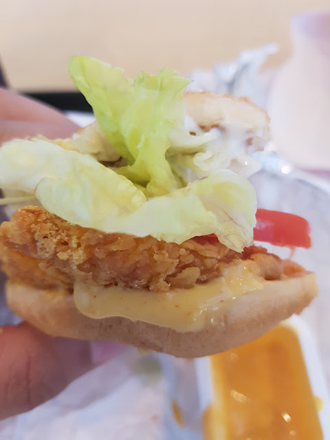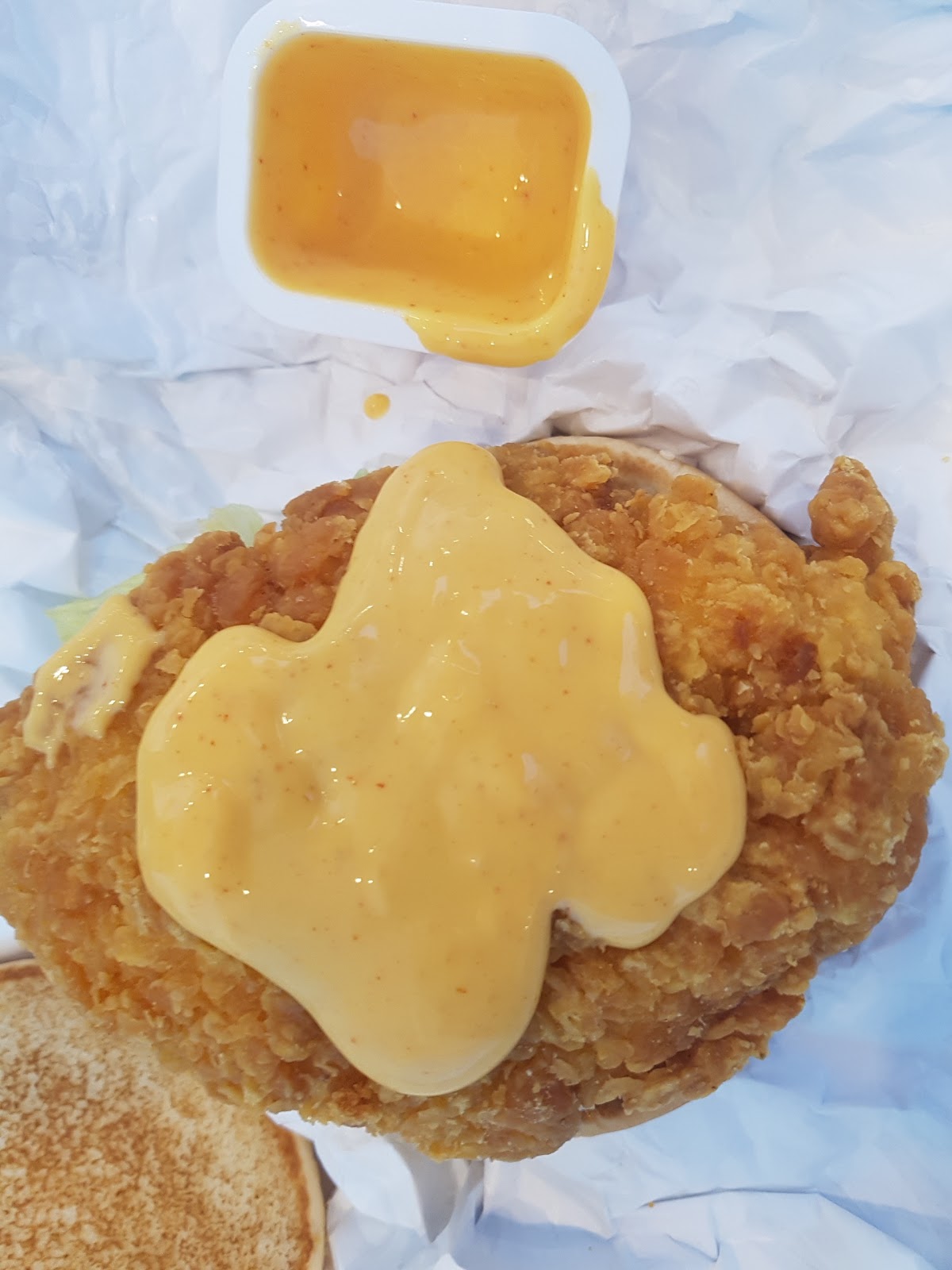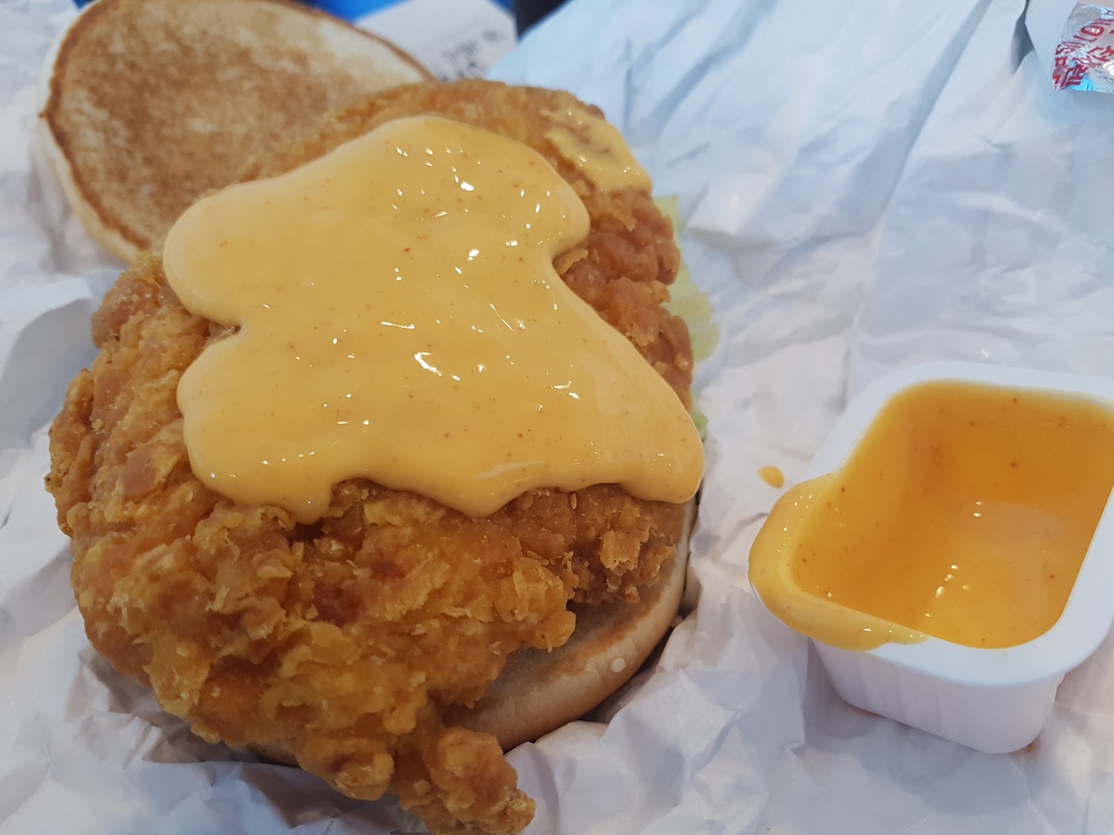 케이준 소스의 뚜껑을 따줍니다. 그러면 이렇게 이쁜 색의 소스가 나오는데요. 상하이 스파이스 치킨 버거가 다소 퍽퍽한 감이 있는데, 입에서 매끄럽게 씹히는 맛을 이 케이준 소스가 준다고 할 수 있어요.