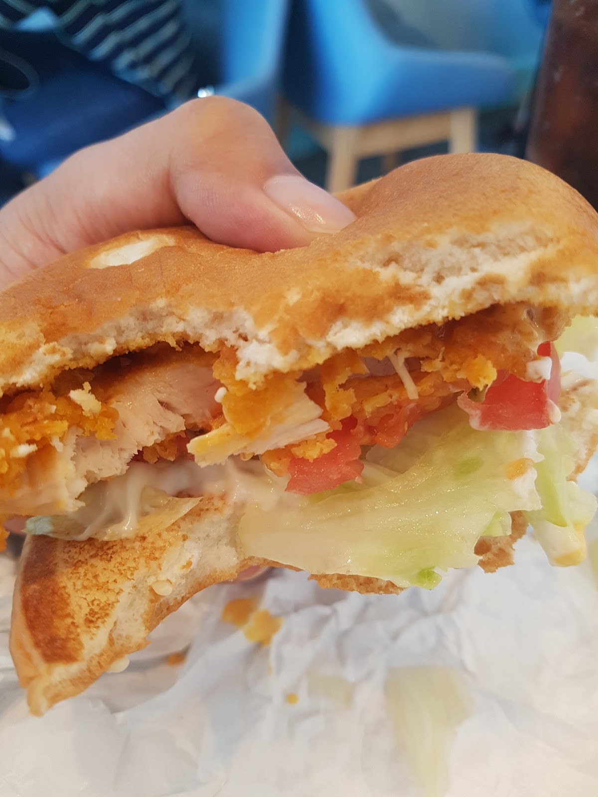메인인 상하이 스파이스 치킨 버거입니다. 포장지를 벗기니, 뒤집어져있네요.