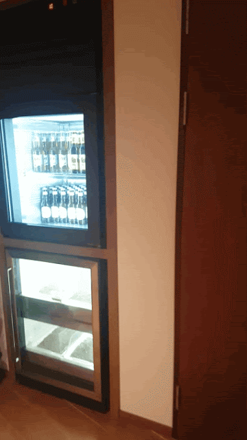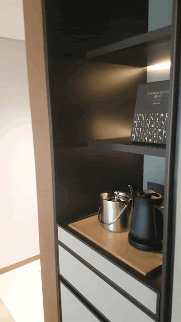 そしてチパトとアイスバケットがあって、上の棚にルームサービスのメニューがあります。価格は合理的です。でもラウンジのサービスを利用しながら、継続食べる予定なので、ルームサービス利用日はありません。引き出しを開けば、ティーカップ、ワイングラス、コーヒー、ティーバッグ、ワインオープナーまでに、います。コーヒーはポールバセットの製品なんですよ。そして下にはミニ冷蔵庫です。ビール、サイダー、水があり、すべて無料で提供されている点、私の満足度がますます上がっています。ハハ。追加占めは、X、およびワードローブと金庫です。。