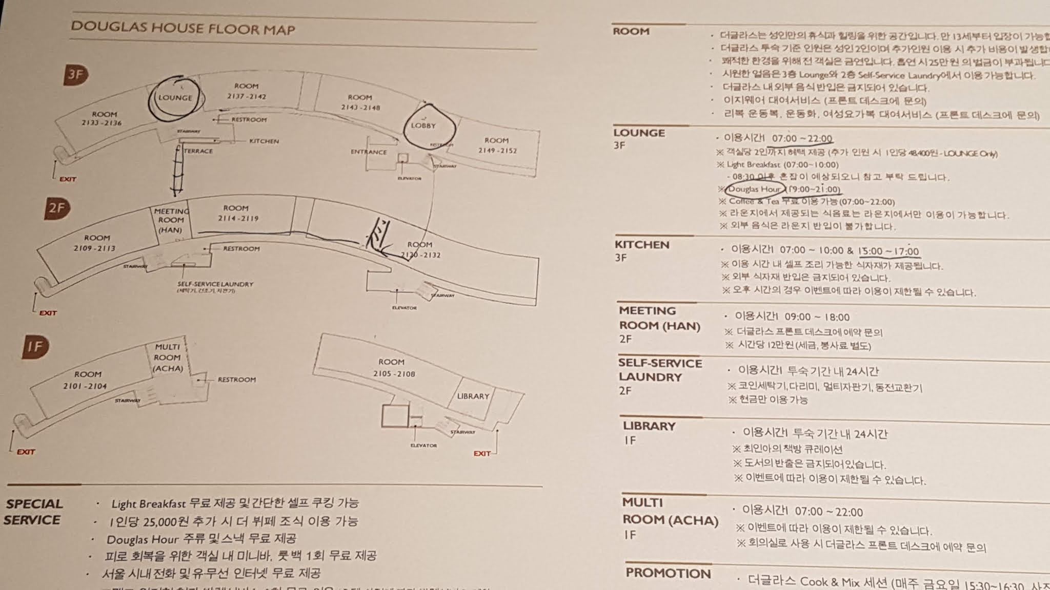 체크인할 때 받은 "워커힐" "더글라스 하우스"의 스테이 안내서입니다. "더글라스 하우스"는 총 3층입니다.