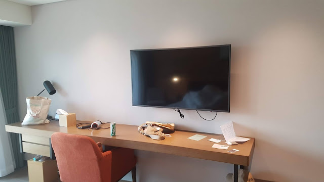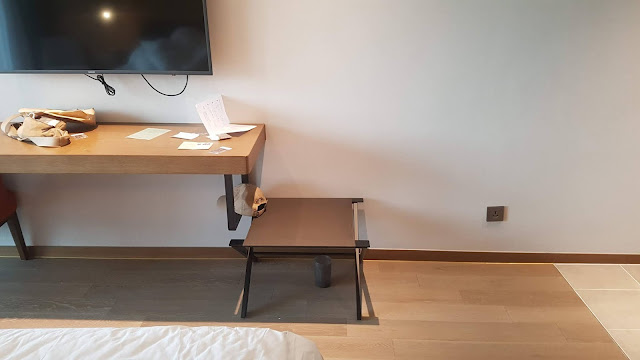 객실 인테리어가 깨끗한 원목으로 되어 있어요. 재대로 치유되는 느낌이에요. 서울 한복판에서 캠프 느낌 나더라구요. 침대와 그 앞에 넓직한 테이블. 방 자체가 굉장히 넓고요. 침대 성인 4명까지 누을 수 있을 겉 같더라구요. 침대 상태도 개인적으로 너무 좋았어요. 괜히 5성급은 아니구나라는 생각들었어요.