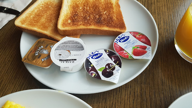 Selamat malam, saya keluar untuk sarapan. Di situ tertulis sarapan Eropa, tapi sangat sederhana. Tapi itu bagus. Rapi dan bersih. Menu sarapan prasmanan meliputi: peralatan makan, sereal dan telur elvan, garam, kacang-kacangan dan cranberry kering untuk topping sereal, susu, irisan ham, telur free-to-eat, anggur dan yogurt sebagai buah-buahan,