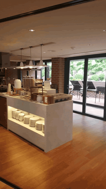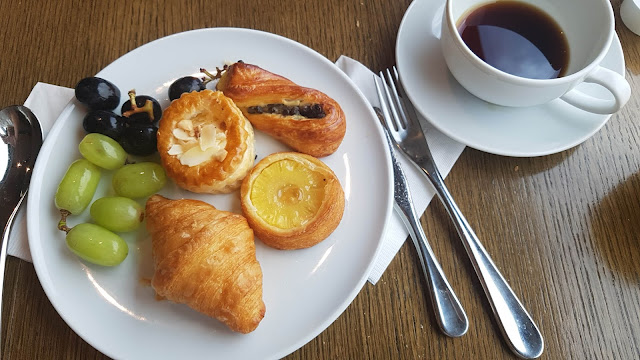 잘 자구 조식 먹으러 나왔어요. 유러피안 조식이라고 되어 있는데 정말 간단 조식이에요. 근데 좋았어요. 깔끔 정갈. 조식 뷔페 메뉴는: 식기류, 씨리얼과 맥반석 계란, 소금, 씨리얼 토핑 용 견과와 건크린베리, 우유, 슬라이스 햄과, 자유롭게 만들어 먹는 계란, 과일로 포도와 요거트,