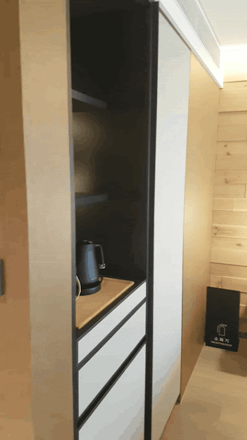 그리고 티팟과 아이스버켓이 있고요, 위 선반에 룸서비스 메뉴있습니다. 가격 터무니없진않아요. 나름 합리적, ㅋㅋ(그치만 라운지 이용하면서 계속 먹기 때문에 룸서비스 이용할 일 X) 서랍을 열으면, 티컵, 와인 글라스, 커피 티백, 와인 오프너까지, 다 있습니다. 커피는 폴바셋 제품이더라구요. 그리고 아래에는 미니 냉장고에요. 맥주 사이다 물있는데, 전부 무료로 제공되는 점, 만족도가 올라갈 수밖에 없게 해놨더라구요. 추가 차지 X 그리고 옷장과 금고입니다.
