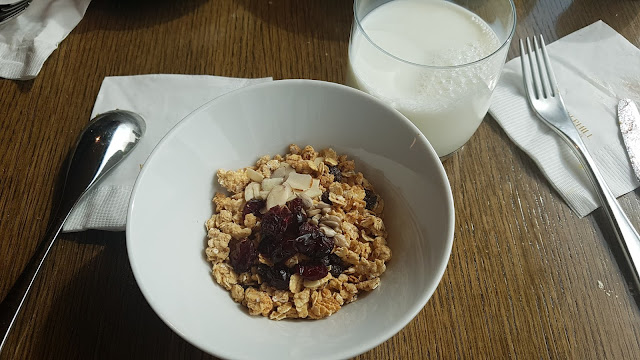 Chúc ngủ ngon, tôi ra ngoài ăn sáng. Nó nói bữa sáng kiểu Âu, nhưng nó thực sự đơn giản. Nhưng nó là tốt. Gọn gàng và ngăn nắp. Thực đơn bữa sáng tự chọn bao gồm: bộ đồ ăn, ngũ cốc và trứng elvan, muối, các loại hạt và nam việt quất sấy khô cho ngũ cốc, sữa, giăm bông cắt lát, trứng ăn tự do, nho và sữa chua trái cây,