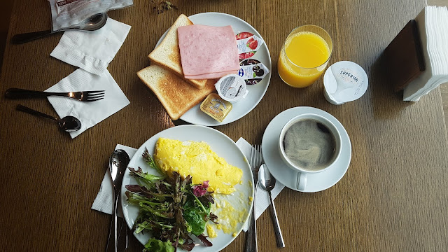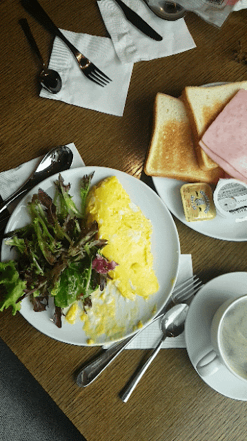 Saya makan di meja seperti ini. Omelet, salad, irisan ham, roti dan selai, kopi, yogurt, jus jeruk. Tidak apa-apa jika Anda melihat hampir semua menunya keluar. Itu adalah makanan sederhana untuk sarapan hotel.