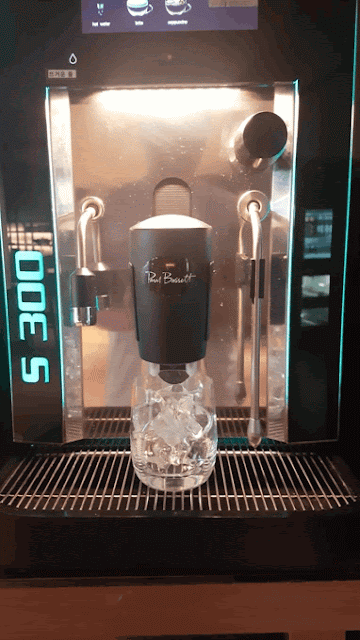 Tôi đã có thể thưởng thức cà phê của Paul Bassett với những lần đổ đầy không giới hạn. Tôi cũng đã uống cà phê đá. Đá cũng có trong tủ lạnh dưới máy pha cà phê.