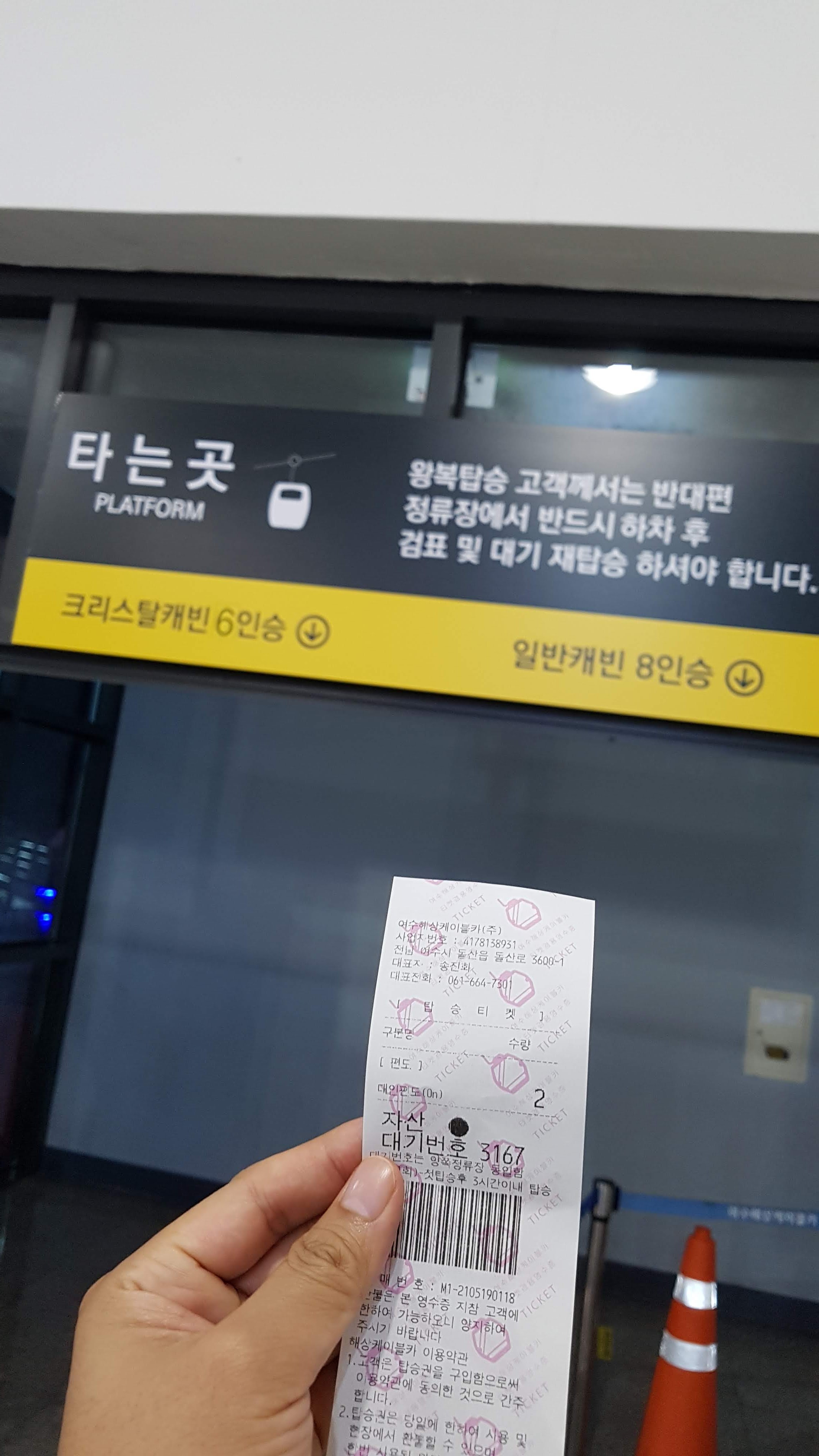 Buổi sáng tốt lành. Tôi đã thử "Cáp treo biển Yeosu". Đi "Cáp treo biển Yeosu" là cách hoàn hảo để thưởng ngoạn cảnh đêm của Yeosu. Tôi đã mua trước một phiếu mua hàng từ Klook và đặt chỗ trước, vì vậy tôi đã có thể đi với mức giá chiết khấu.