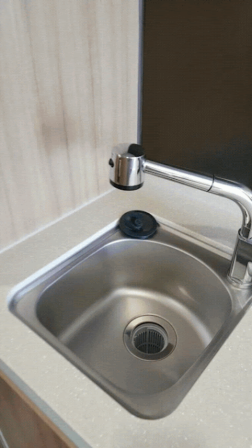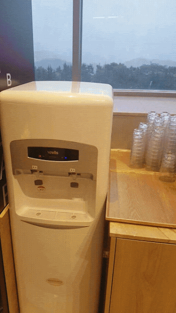 호텔이지만 심플 키친이 있습니다. 스토브는 없어요! 커피포트와 간단한 티백, 티컵이 위에 있어요. 싱크대만 있고, 아래에는 미니 냉장고가 있어요. 무료 생수는 2병!