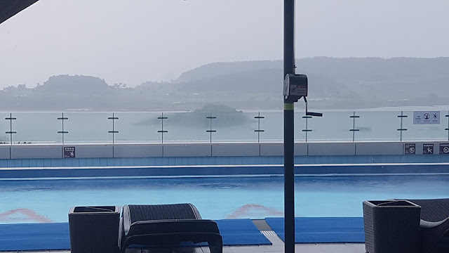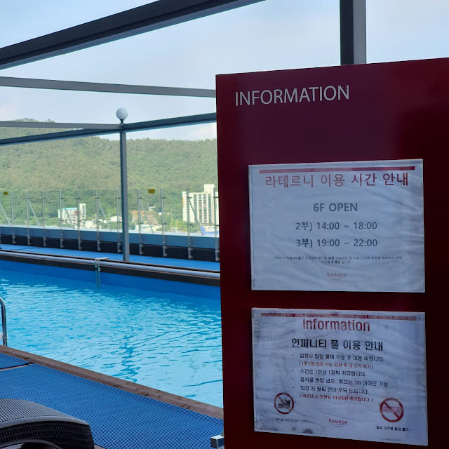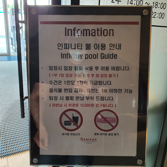 "라마다 프라자 돌산 여수"는 수영장이 2개에요. 5층 그리고 6층에 있습니다. 그리고 여기는 5층에 있는 라테르니 인피니티 풀이에요. 운영시간은 1부 09:00 ~ 13:00, 2부 14:00 ~ 18:00, 3부 19:00 ~ 22:00입니다. 입장료는 성인용 20000원, 어린이용 15000원입니다.(호텔 이용객에게 무료가 아니라니?!!)