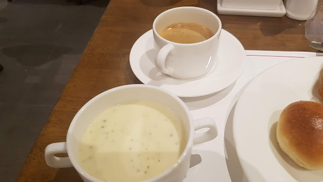 양식으로 즐겨볼게요. 모닝빵, 크로와상, 파이 그리고 잼을 가져왔습니다. 빵은 평범한 맛이에요. 스프와 커피도 먹었습니다.