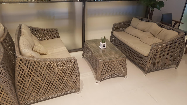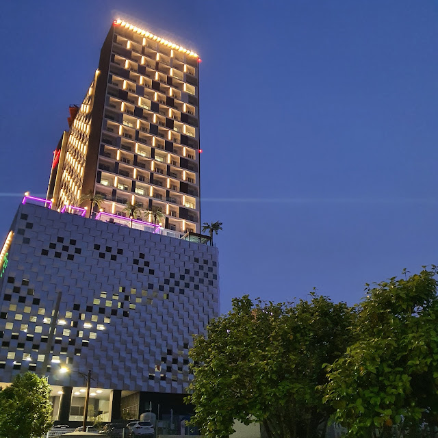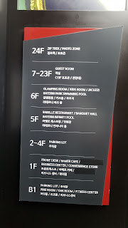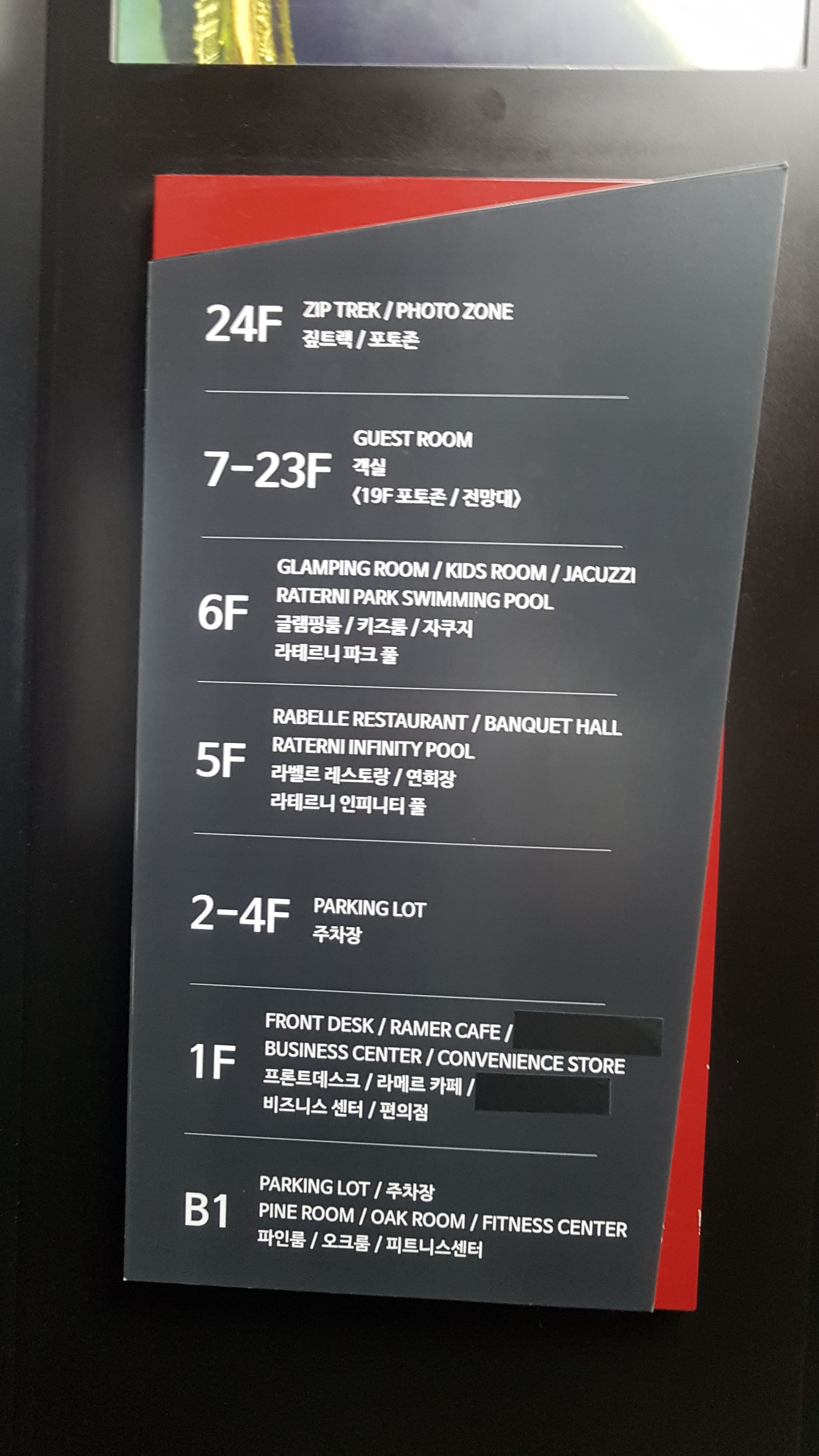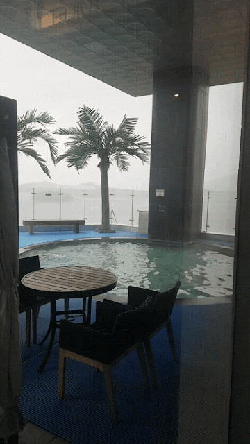 이 호텔에는 휴양지의 안락한 소파가 로비 밖에 있어요. 휴식을 취할 수 있는 공간이 곳곳에 있습니다. 이 호텔의 건물은 5~6층은 식당과 예식장이 있고 "인피니티 풀"이 있어요. 7~23층은 객실입니다. 24층에는 "짚트랙"을 탈 수 있는 곳이에요!