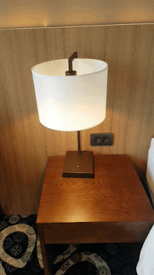 침대 옆의 협탁들입니다. 한쪽은 인터폰과 멀티 충전기가 있어요. 그리고 위에 룸 컨트롤러도 있다는 점 꼭 기억해주세요. 그리고 그 반대편에는 간단하게 스탠드와 소켓을 보여요. 테라스 쪽으로 안락의자와 테이블이 있습니다. 완벽한 휴식 공간이에요!